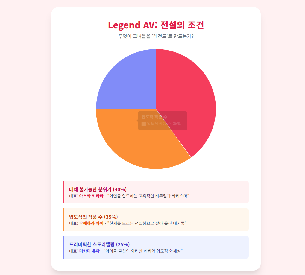 이 그래프는 역대급 레전드 AV 배우가 전설이 되는 3가지 핵심 조건을 제 경험과 커뮤니티 데이터를 바탕으로 분석한 자료입니다. 대체 불가능한 분위기가 가장 큰 비중을 차지합니다.